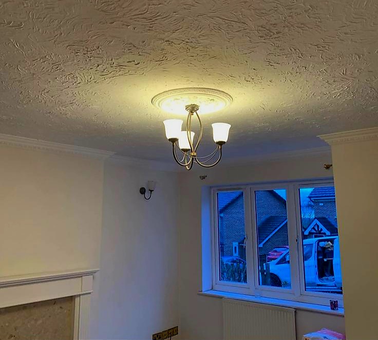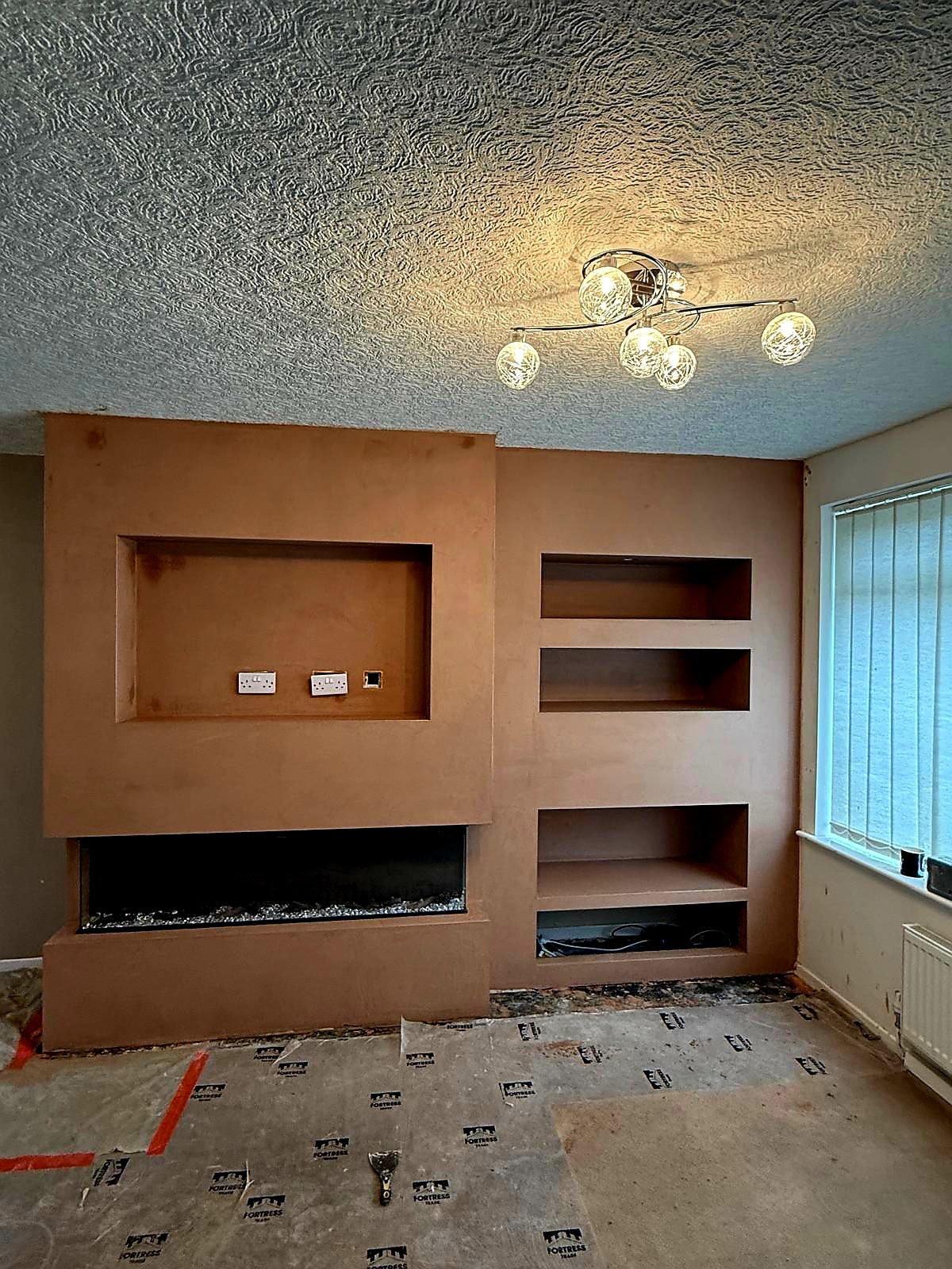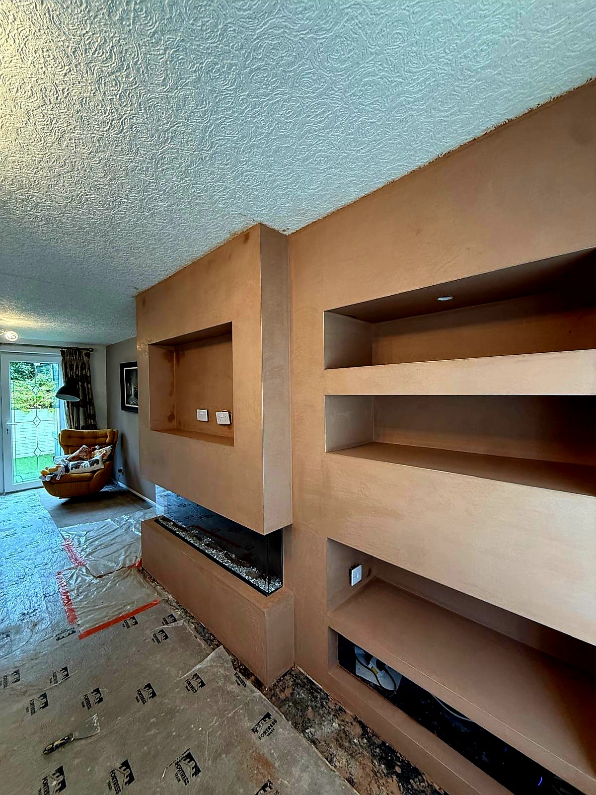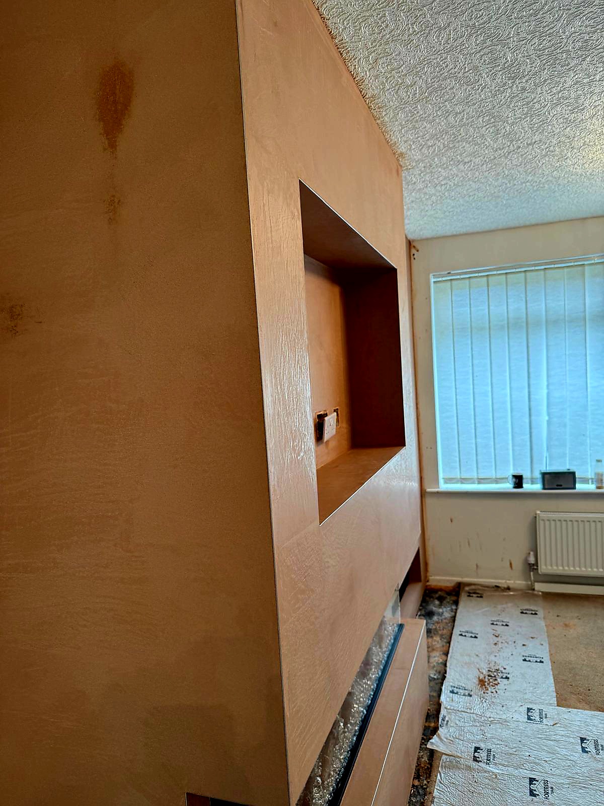 Bringing dated or damaged textured finishes back to a clean, modern standard — including repairs, bonding where required, and a smooth skim ready for decorating. (Includes a media wall build-up stage.)